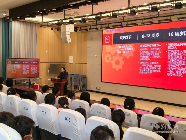 活動中,武昌區(qū)人民法院白沙洲法庭余意法官以《未成年人民事法律行為效力》為題,用“未成年人網(wǎng)購貴重物品是否有效”等案例,按年齡分層解析法律責(zé)任邊界,讓學(xué)生快速厘清不同階段的民事行為效力,直觀感受憲法及民事法律對青少年權(quán)益的保護。