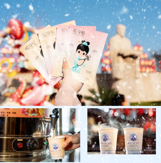 溫馨提醒:園中的披風(fēng)可以免費(fèi)租借,多處店家有暖寶寶免費(fèi)領(lǐng)取和紅糖姜茶免費(fèi)熱飲,在清明上河園,風(fēng)雪再大亦有“晚來(lái)天欲雪,能飲一杯無(wú)”的暖意。