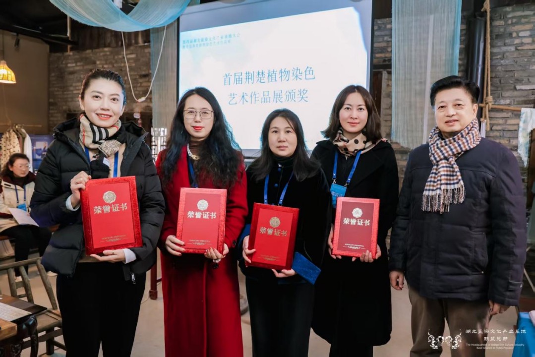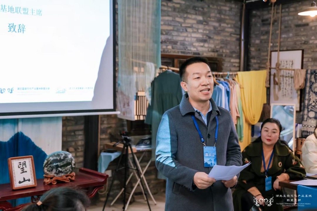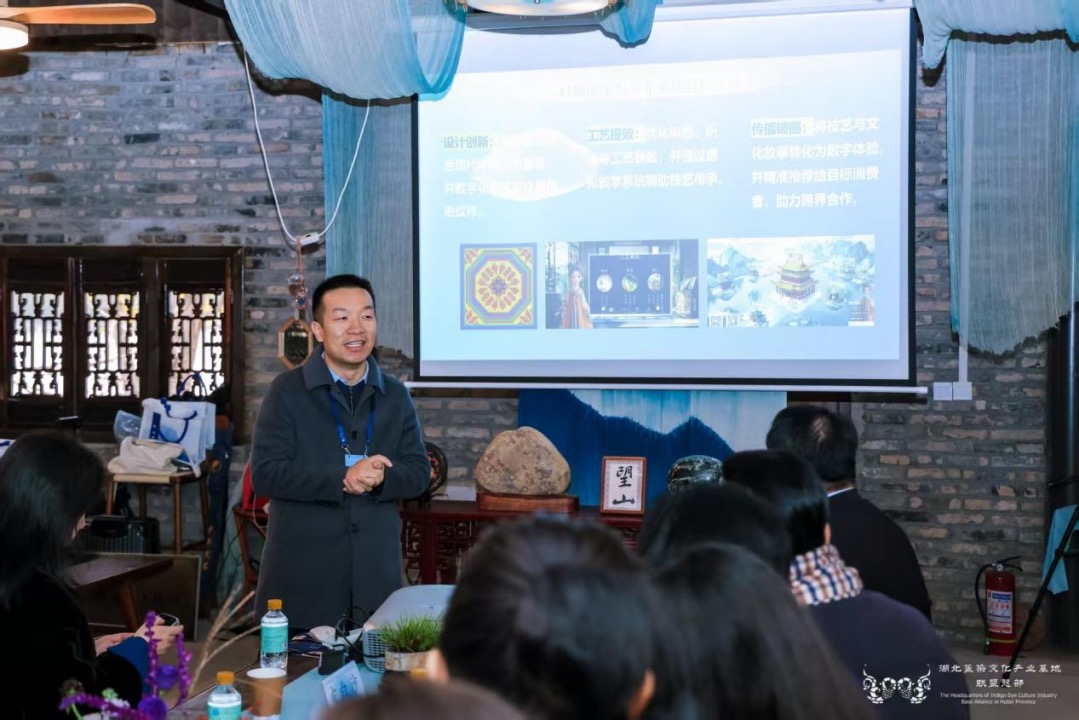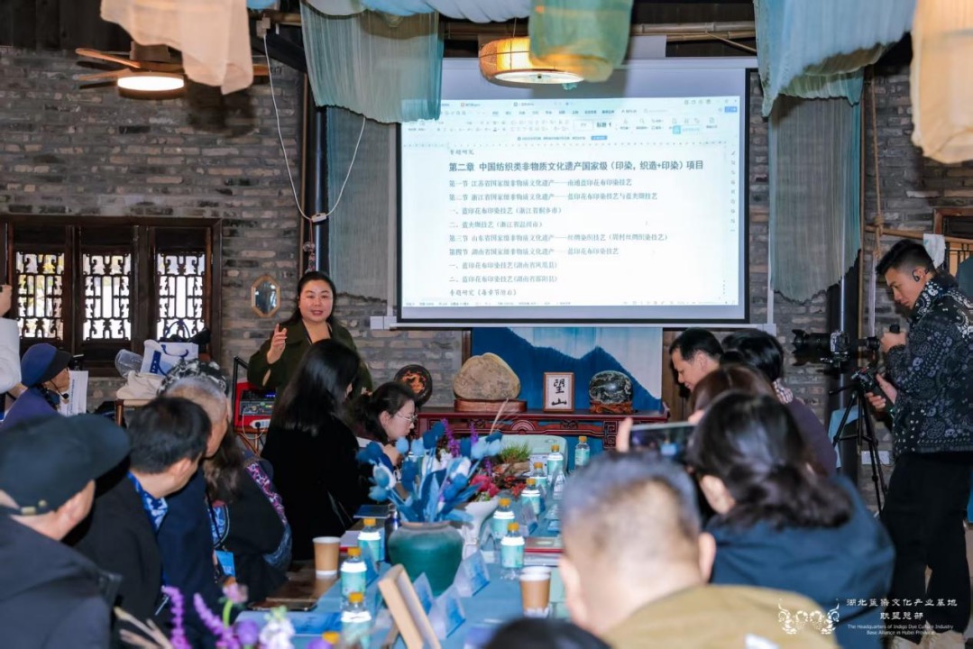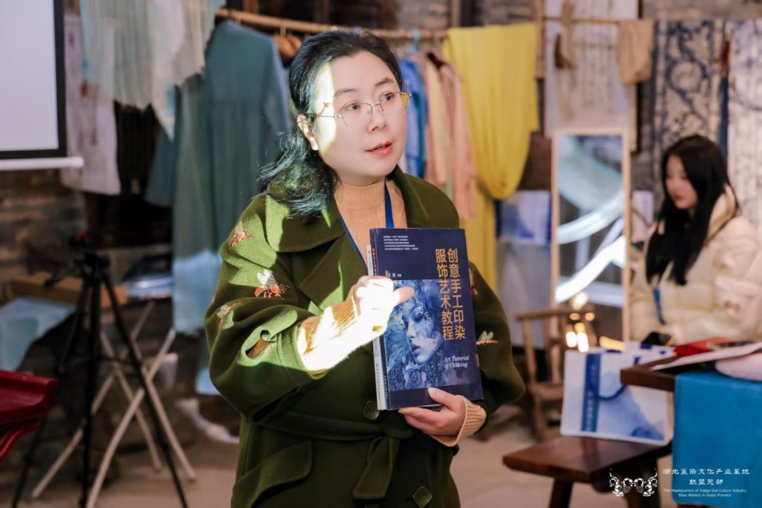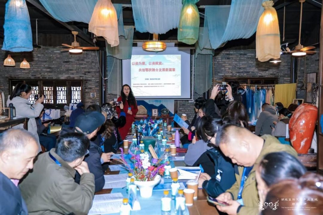 論壇環(huán)節(jié)分為“專家論壇”與“傳承人論壇”兩大板塊。在專家論壇板塊,華中師范大學國家文化產業(yè)研究中心孫傳明教授分享了“AI時代紡織類非遺的創(chuàng)新性發(fā)展”,并通過豐富的案例探討了AI技術對紡織印染類非遺的創(chuàng)新性轉化與創(chuàng)造性發(fā)展。西安美術學院石歷麗教授分享了“以染為媒,以美賦能,共創(chuàng)鄂陜融合發(fā)展”的思考。德清集彩文化創(chuàng)意有限公司宋立董事長分享了“天然染色市場應用”。中國紡織工程學會非遺印染科普傳播專家、武漢紡織大學王妮副教授分享了“中國紡織非遺印染專題研究概述”。在傳承人論壇板塊,多位來自武漢、宜昌、襄陽、黃岡、天門、江夏等地的非遺傳承人,結合自身實踐,講述了藍染技藝在當代的守正創(chuàng)新、工坊運營與公益融合之路。其中,襄陽鴻岳扎染坊主理人朱小妮分享了以植物染技藝助力自閉癥青年就業(yè)的實踐,展現(xiàn)了非遺融入公益、賦能特殊群體的社會溫度。