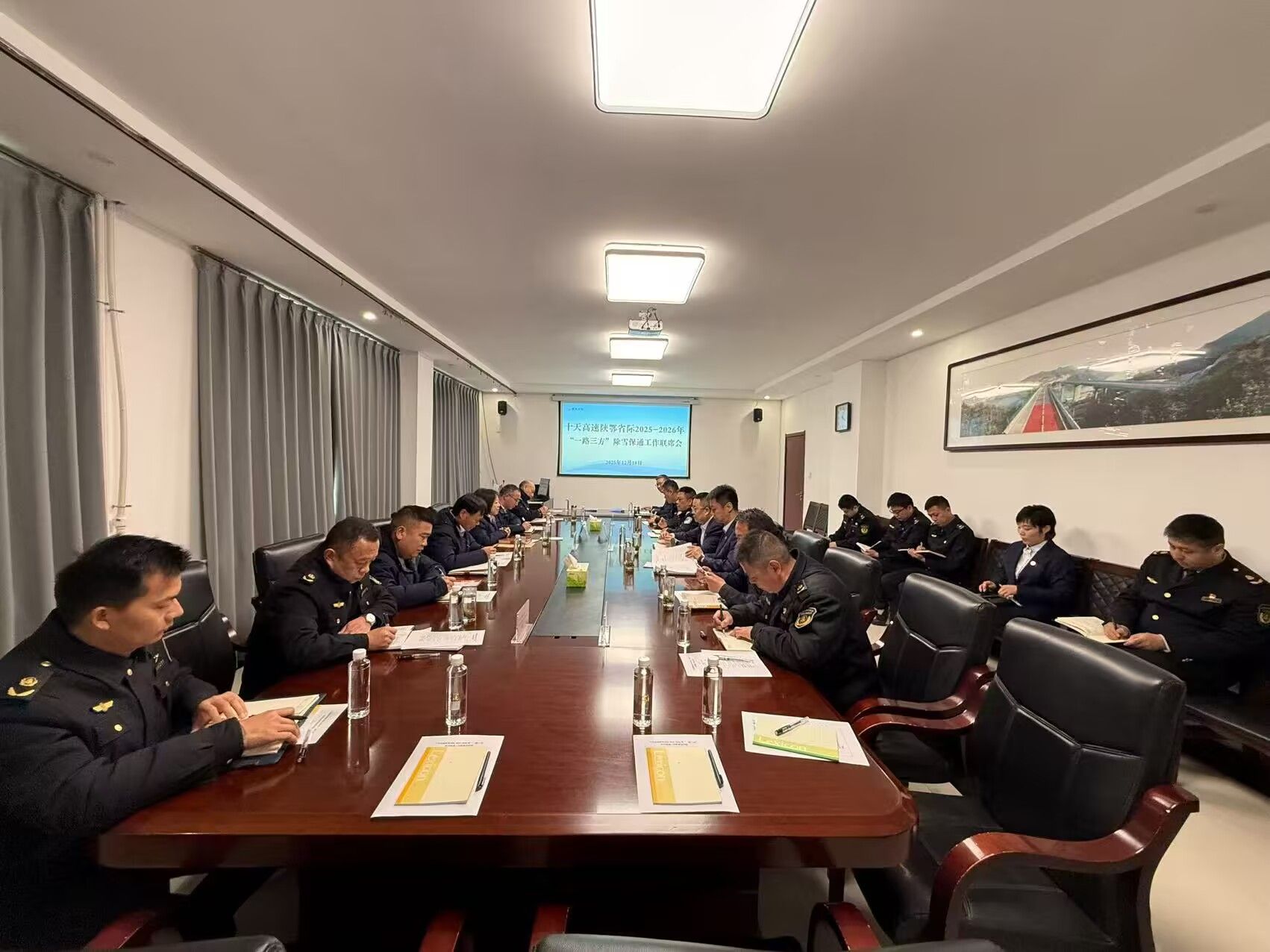 聯(lián)動座談前,省際“一路三方”各單位現(xiàn)場觀摩了除雪防滑應(yīng)急演練,實(shí)戰(zhàn)檢驗(yàn)預(yù)案可行性與機(jī)制運(yùn)行效果,并共同簽訂《十天高速公路陜鄂省際路段“一路三方”跨省聯(lián)勤聯(lián)動協(xié)作協(xié)議》,明確惡劣天氣分級處置流程與省際共管路段責(zé)任分工,推動形成“上下聯(lián)動、左右協(xié)同、全域覆蓋”的區(qū)域應(yīng)急保障格局。