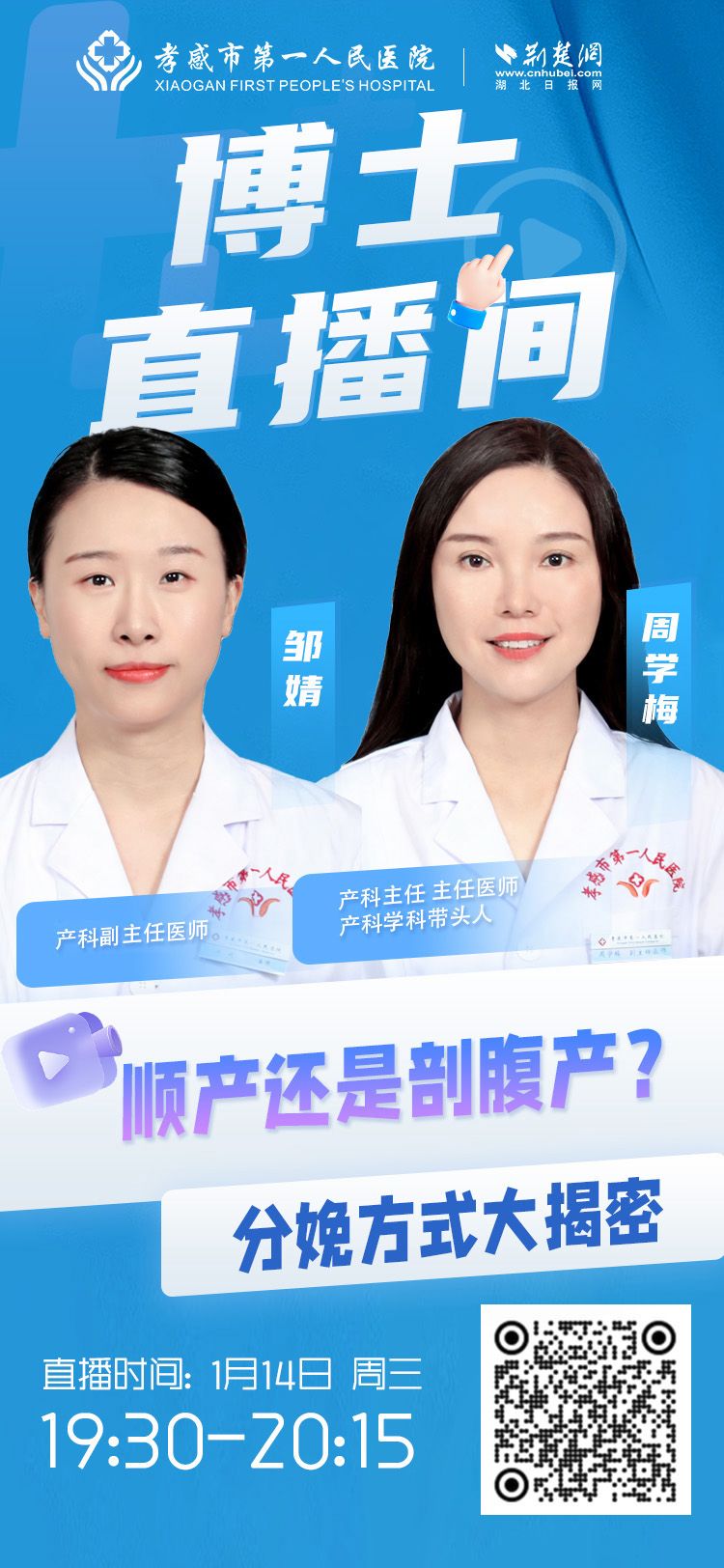 2026年1月14日(周三)19:30-20:15,孝感市第一人民醫(yī)院博士直播間,特邀產(chǎn)科主任周學(xué)梅、產(chǎn)科醫(yī)生鄒婧,結(jié)合數(shù)十年臨床經(jīng)驗(yàn),為你深度解析順產(chǎn)與剖腹產(chǎn)的核心問題:
