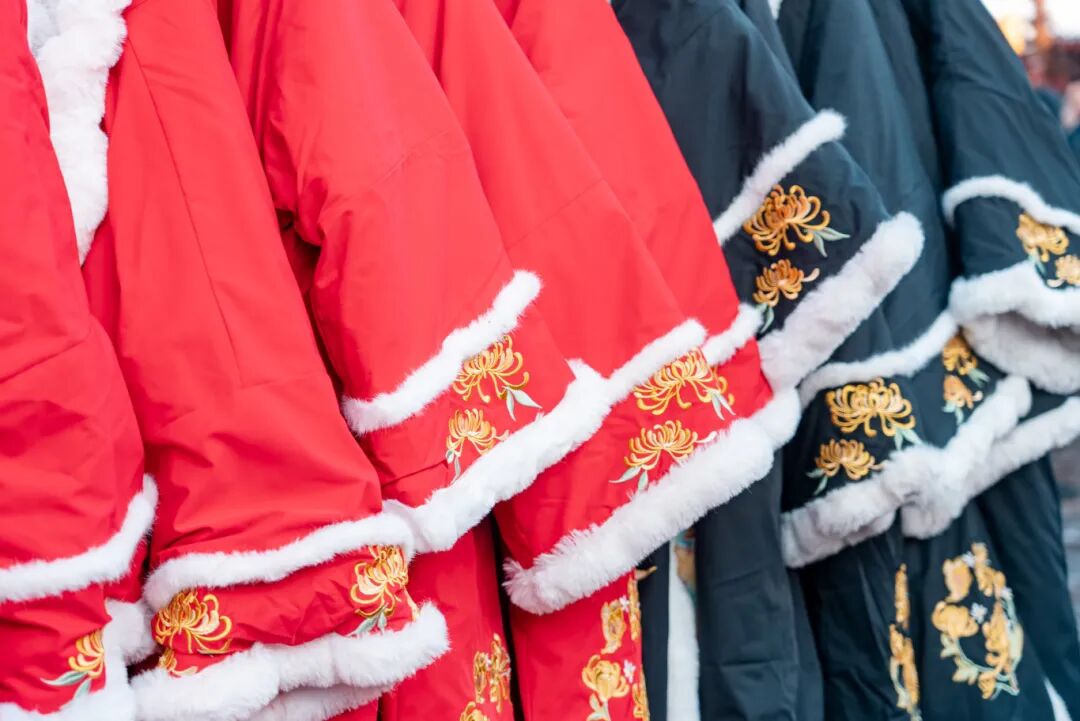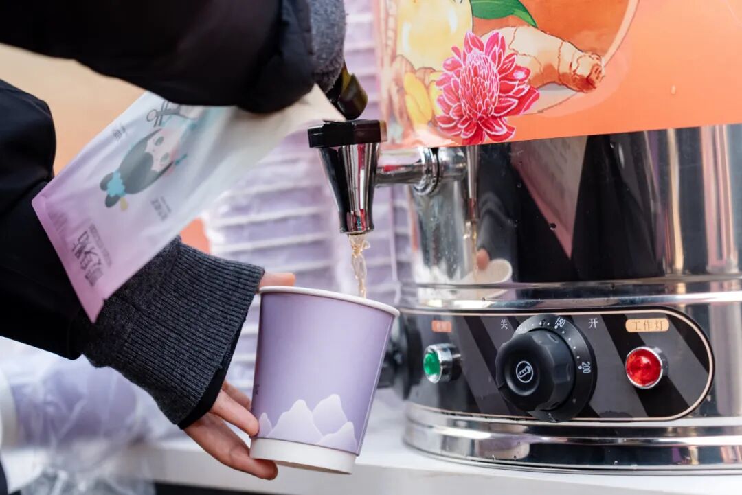 風雪愈急,人間愈暖。賞雪之余,防寒保暖與安全防范也很重要。園中的披風可以免費租借,多處店家有暖寶寶免費領取和紅糖姜茶免費熱飲,在清明上河園,風雪再大亦有“晚來天欲雪,能飲一杯無”的暖意。