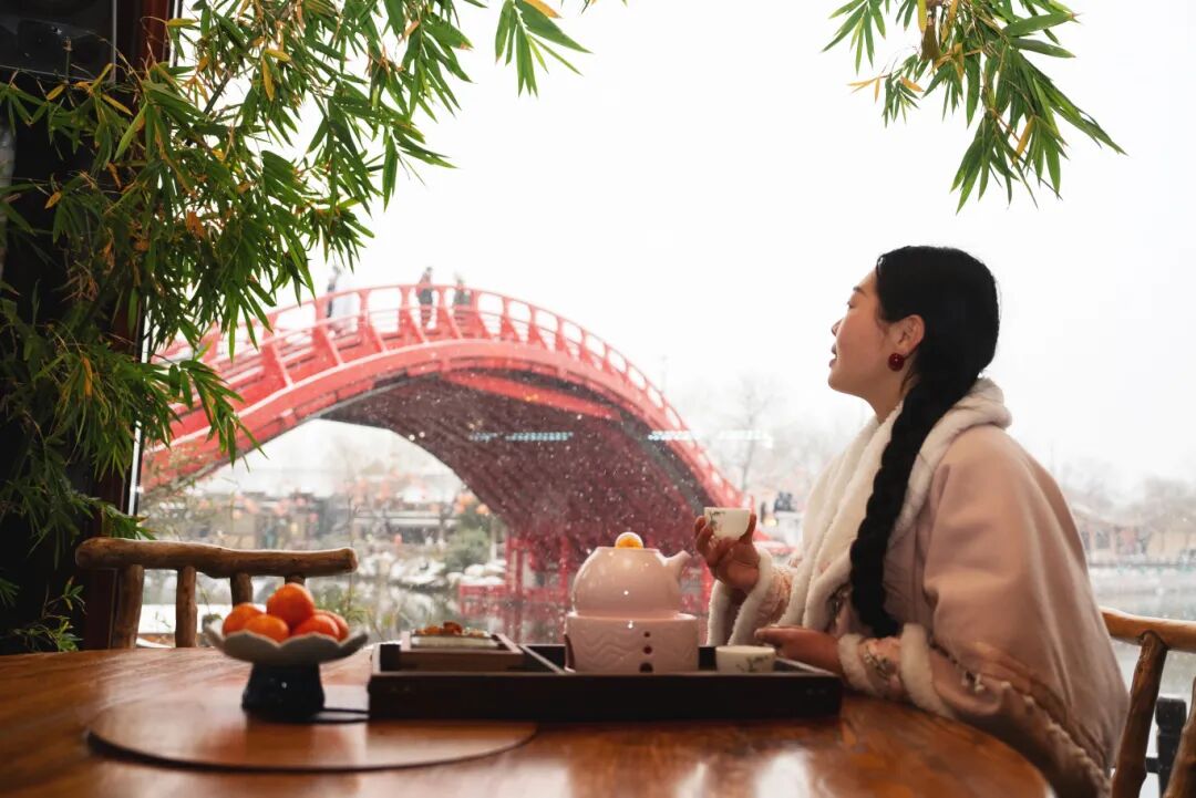 也可以換一身素雅的漢服,漫步在虹橋之上,讓雪花綴滿肩頭,融入雪景版的《清明上河圖》,與千年風雅撞個滿懷。