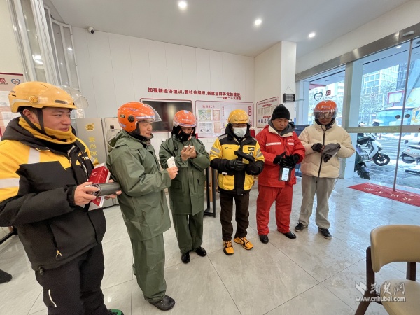 武昌區(qū)總工會維權(quán)服務(wù)部負責(zé)人夏巨波與街道工會工作人員一邊分發(fā)慰問物資,一邊與大家親切交談:“雪天路滑,騎車千萬要慢行,安全第一?!薄绑A站里備了熱水和微波爐,累了隨時進來歇腳,別凍著自己。”