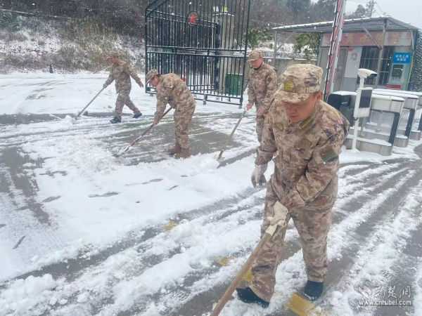 七四三五工廠保衛(wèi)處清掃廠區(qū)大門區(qū)域積雪。 通訊員供圖