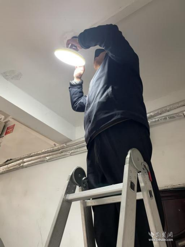楊建華師傅為居民義務(wù)維修樓道感應(yīng)燈。 通訊員供圖
