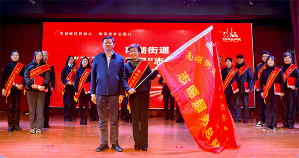 活動的另一重頭戲,是“了不起的居民”志愿服務(wù)總隊(duì)的成立儀式。在區(qū)委社會工作部部長謝琬宣讀成立文件后,區(qū)委副書記、統(tǒng)戰(zhàn)部部長劉海停上臺為總隊(duì)隊(duì)長張淑靜授旗,標(biāo)志著南湖街道近300支活躍的志愿服務(wù)隊(duì)伍,有了統(tǒng)一的旗幟與核心。