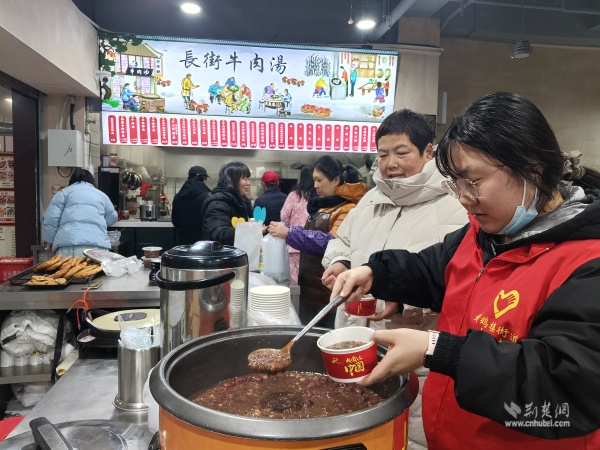 溫暖派送覆蓋多元群體。在戶外勞動者驛站,環(huán)衛(wèi)工人、快遞外賣騎手從志愿者手中接過熱粥;社區(qū)還鏈接武漢市第三醫(yī)院資源,為戶外工作者提供健康咨詢。幾位外賣騎手主動化身“公益騎手”,與黨員志愿者一同將暖心粥品送至“鶴耋安”高齡獨(dú)居老人家中。黨員志愿者還走訪了周邊商戶、殘疾人家庭及退役軍人家屬,并在社區(qū)設(shè)點(diǎn)邀請居民共享溫情。一碗粥,沿著黨員和志愿者的溫暖足跡,流入社區(qū)每個角落。