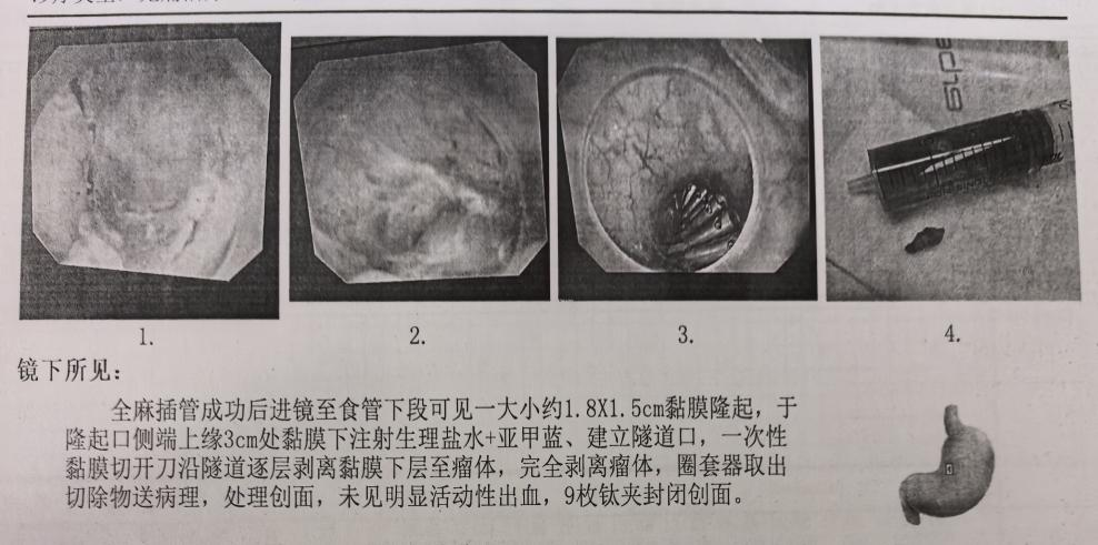患者劉先生因反復(fù)出現(xiàn)吞咽不適、進(jìn)食梗阻感前往醫(yī)院就診。經(jīng)胃鏡檢查,醫(yī)生發(fā)現(xiàn)其食管下段存在隆起性病變,消化內(nèi)科Ⅱ病區(qū)專(zhuān)家團(tuán)隊(duì)結(jié)合患者病情進(jìn)行會(huì)診后,決定采用STER技術(shù)為其開(kāi)展微創(chuàng)治療。手術(shù)在全身麻醉下進(jìn)行,手術(shù)團(tuán)隊(duì)在患者食管黏膜上建立微小“隧道”,通過(guò)該隧道精準(zhǔn)切除病變組織,隨后用9枚鈦夾妥善夾閉創(chuàng)口,整個(gè)手術(shù)過(guò)程出血極少,進(jìn)展順利。