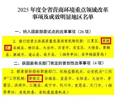 近日,湖北省優(yōu)化營商環(huán)境領(lǐng)導(dǎo)小組對2025年度全省優(yōu)化營商環(huán)境重點領(lǐng)域改革事項及成效明顯地區(qū)進行通報表揚。其中,黃陂政務(wù)服務(wù)領(lǐng)域兩項創(chuàng)新改革納入國家部委試點,獲國家有關(guān)部門肯定,彰顯區(qū)域改革擔當與服務(wù)實力。