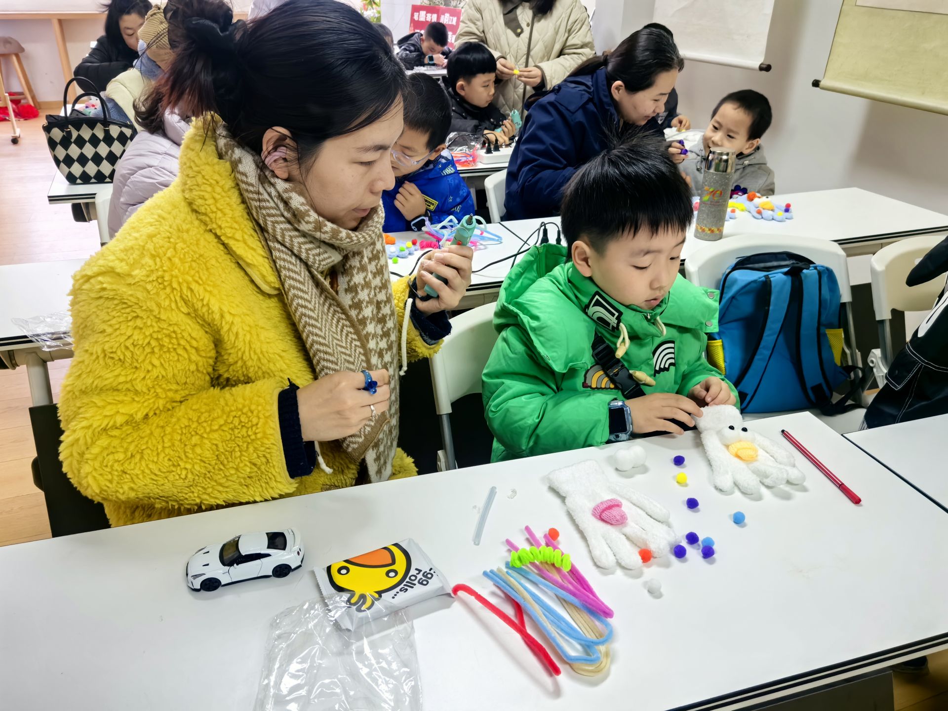 活動(dòng)開(kāi)始,指導(dǎo)老師先為大家簡(jiǎn)要講解了傳統(tǒng)布藝中“拼接點(diǎn)綴、化繁為簡(jiǎn)”的制作理念。隨后,通過(guò)一步步的示范,引導(dǎo)大家將萌趣材料與傳統(tǒng)技法相結(jié)合。在創(chuàng)作環(huán)節(jié),家長(zhǎng)們耐心協(xié)助孩子固定面料、梳理細(xì)節(jié);孩子們則充分發(fā)揮天馬行空的想象力,用扭扭棒彎折出立體的耳朵與花紋輪廓,將彩色毛球粘貼成點(diǎn)綴裝飾,再為手套貼上靈動(dòng)的小眼睛。