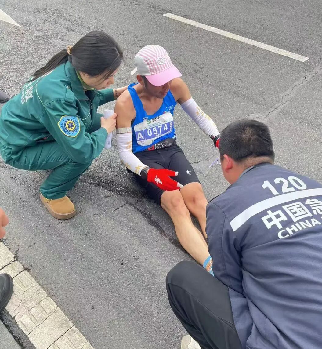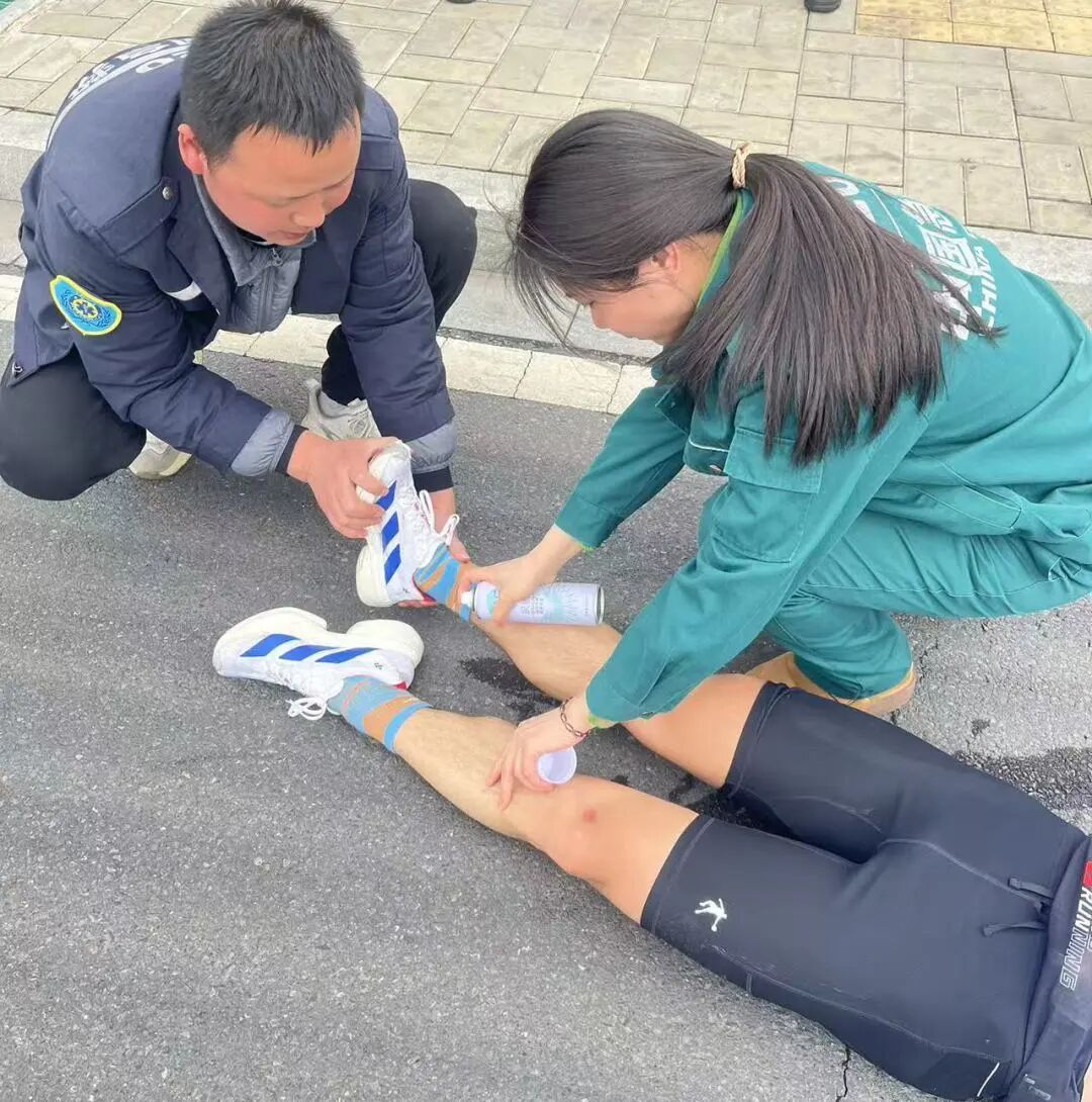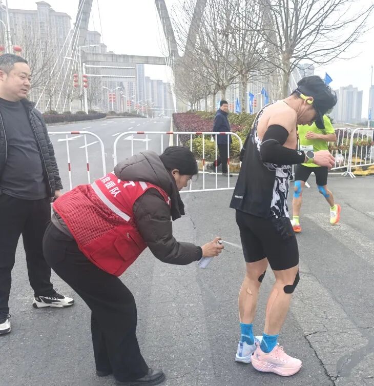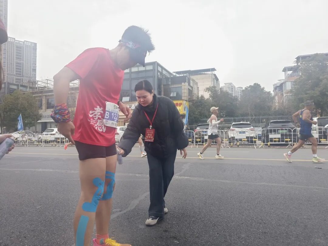 “膝蓋不舒服是嗎?來,坐下我?guī)湍纯础!痹谌R37.5km處,醫(yī)生劉書明已經(jīng)記不清這是第幾次蹲下為跑者處理傷情。肌肉拉傷、關(guān)節(jié)扭傷、皮膚擦傷……面對(duì)各種常見運(yùn)動(dòng)損傷,他和搭檔張春珍、嚴(yán)郁婷處置精準(zhǔn),還不忘送上句句加油暖心鼓勵(lì)。