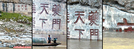 昨日上午,瞿塘峽夔門摩崖題刻中的“踏出夔巫打走倭寇”字開始沒入江中。夔門摩崖題刻頂端的水位線是126米,蓄水完后,這些字跡會(huì)被全部淹沒。當(dāng)?shù)夭块T已對(duì)這些文物進(jìn)行了保護(hù)。 湖北日報(bào)記者周立新攝