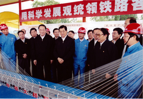 2005年8月22日上午,中共中央總書記、國家主席、中央軍委主席胡錦濤同隨行的中共中央政治局候補委員、中央書記處書記、中央辦公廳主任王剛,在中共中央政治局委員、湖北省委書記俞正聲,湖北省省長羅清泉等陪同下,考察了正在建設(shè)中的武漢天興洲公鐵兩用長江大橋工程,對鐵路建設(shè)作出重要指示。胡總書記指出,武廣鐵路客運專線和武漢天興洲大橋是中國鐵路建設(shè)史上新的里程碑。這條鐵路線的建設(shè)標(biāo)志著中國鐵路客運專線建設(shè)的開始,今后要建設(shè)更多的鐵路客運專線。一定要把武廣客運專線和天興洲大橋這個我國鐵路建設(shè)史上新的里程碑工程建設(shè)好。