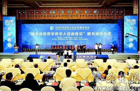 圖為:昨日上午,2016年“華創(chuàng)會”在武漢東湖國際會議中心開幕。圖為“湖北省政府華僑華人咨詢委員”聘書頒發(fā)儀式現(xiàn)場。...">